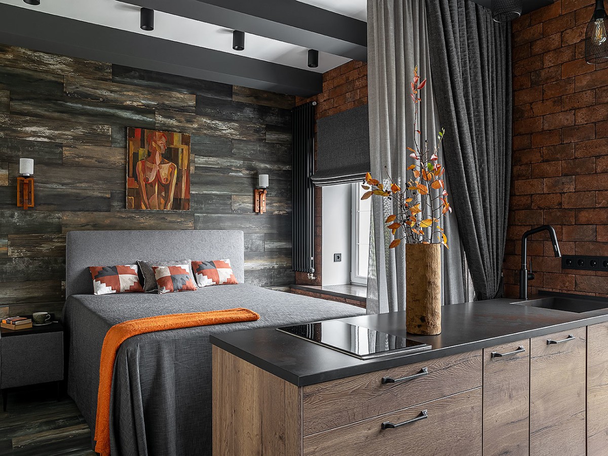 Несмотря на скромные размеры помещения, но, принимая во внимание то, что студия находится в отреставрированном здании, где раньше размещался завод, идеальным решением стал стиль лофт.