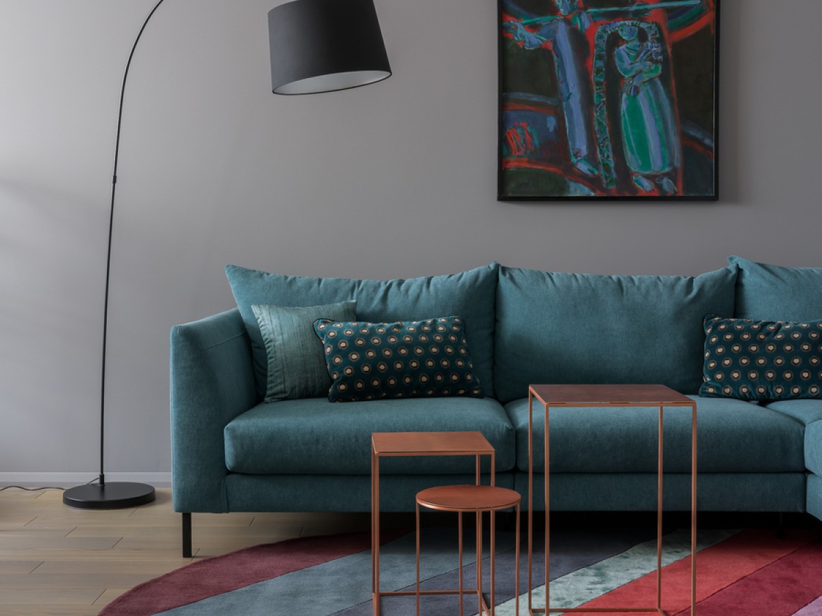 Яркая голубая обивка – акцентный прием, который поддерживается в холодной палитре геометричного ковра и цветовой гамме картины.