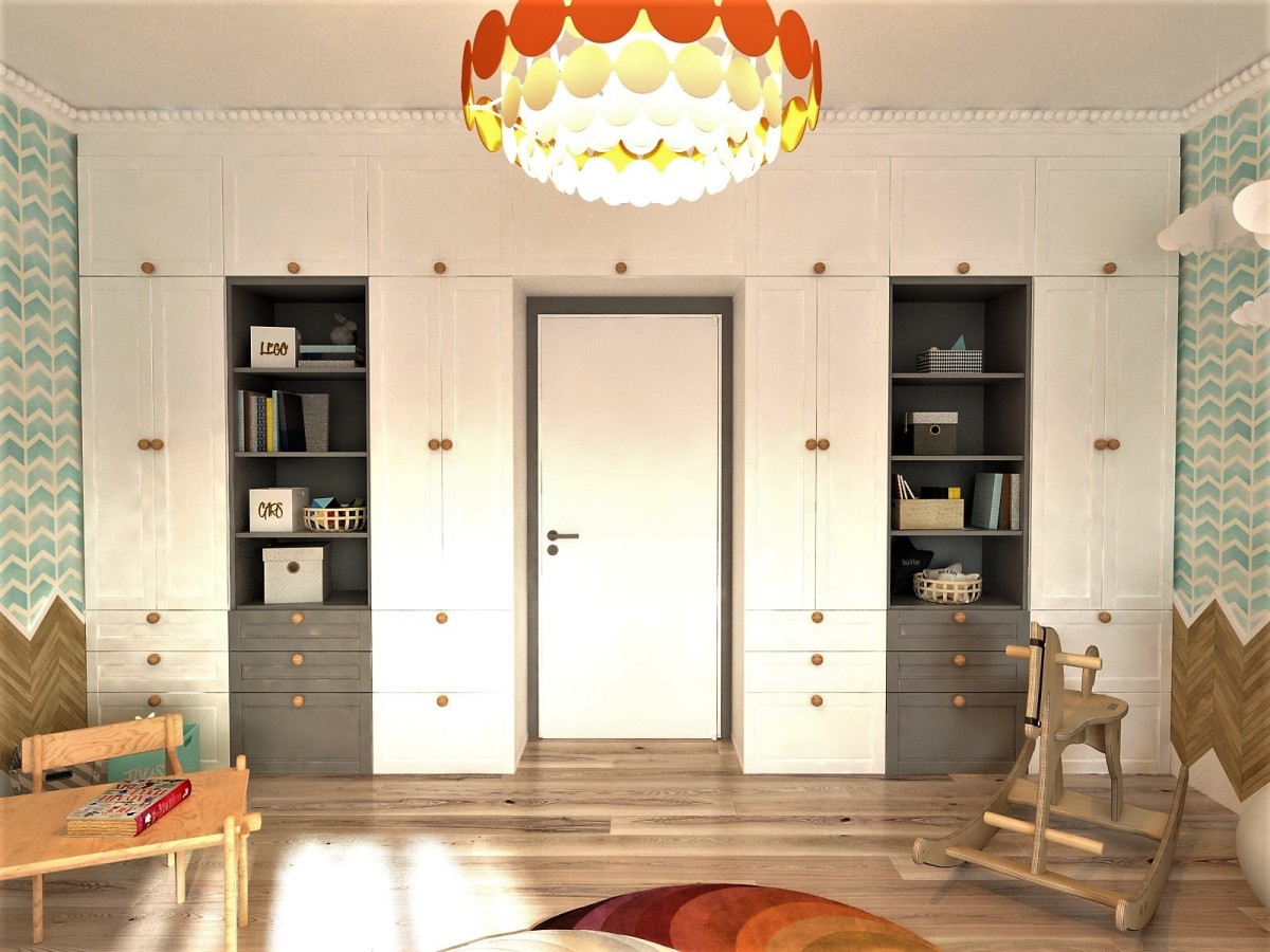 Правильная организация системы хранения (расположенные по одной стене встроенные шкафы, стеллажи и антресоли) решает вопрос безопасности, организации порядка и хранения вещей, игрушек и детских принадлежностей, освобождает место для игр, творчества, физического и интеллектуального развития ребенка.