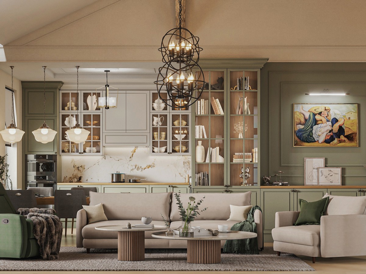 В основе интерьера — спокойная природная палитра: бежевые, оливковые и приглушённые натуральные оттенки.