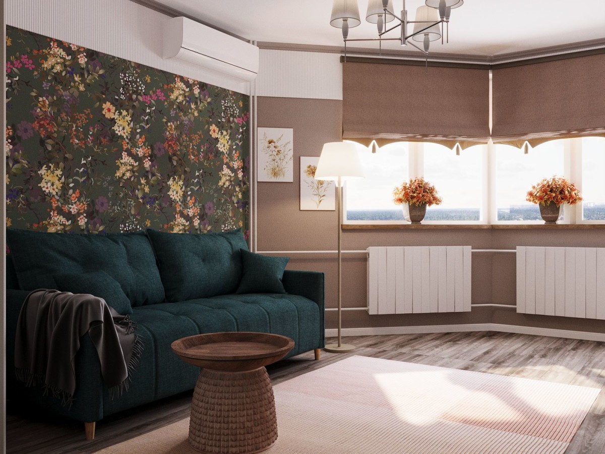 Женственный характер комнат подчеркивает флористический принт обоев на акцентной стене – прием, который повторяется в обеих комнатах, стилистически объединяет пространство и выстраивает композиционную логику.