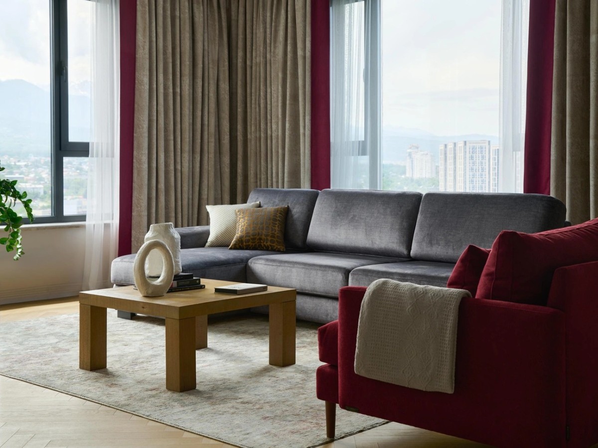 Бардовый оттенок кресла повторился в декоре штор с авторским принтом.