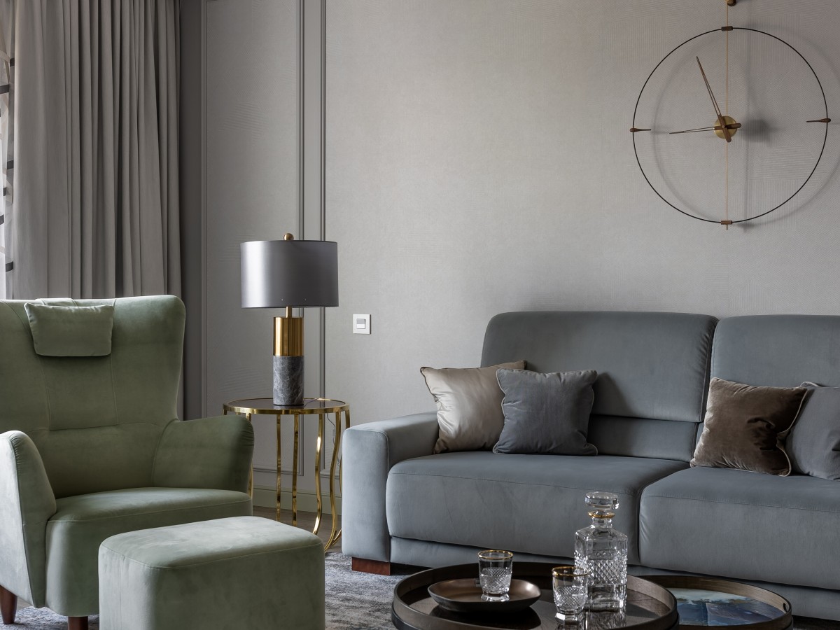 Диван мы дополнили креслами Tilda с пуфом в контрастном салатном оттенке.