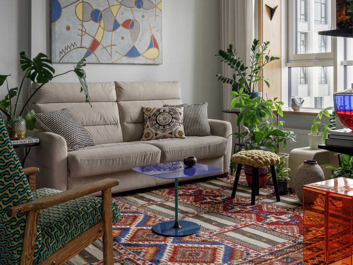 В уютной гостиной друг друга дополнили пестрый марокканский ковер ручной работы и сдержанный диван Comforto от мастеров фабрики HAUSKA.