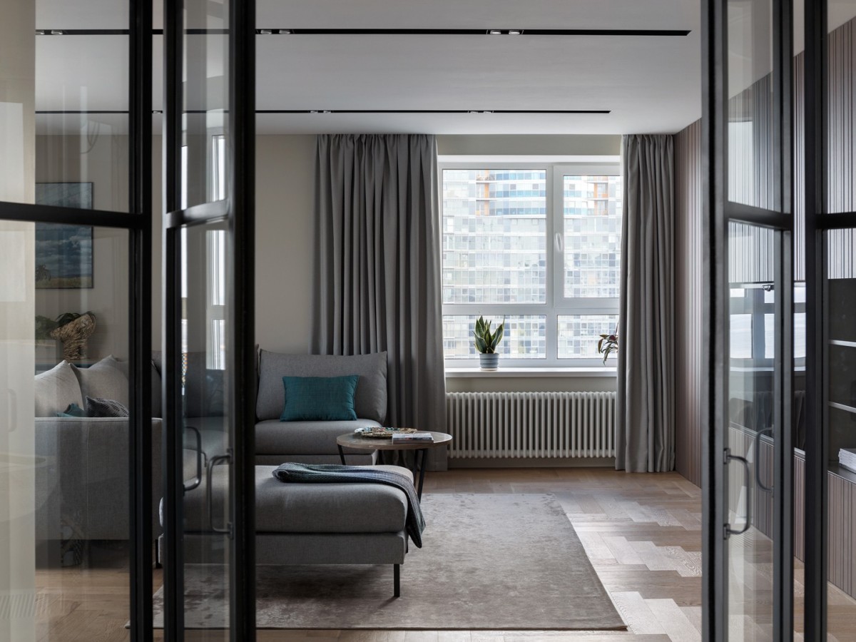 В отделке используется много натуральных материалов, бетон, стекло, металл, шпон дерева, фанера, камень и спокойные самодостаточные цвета.