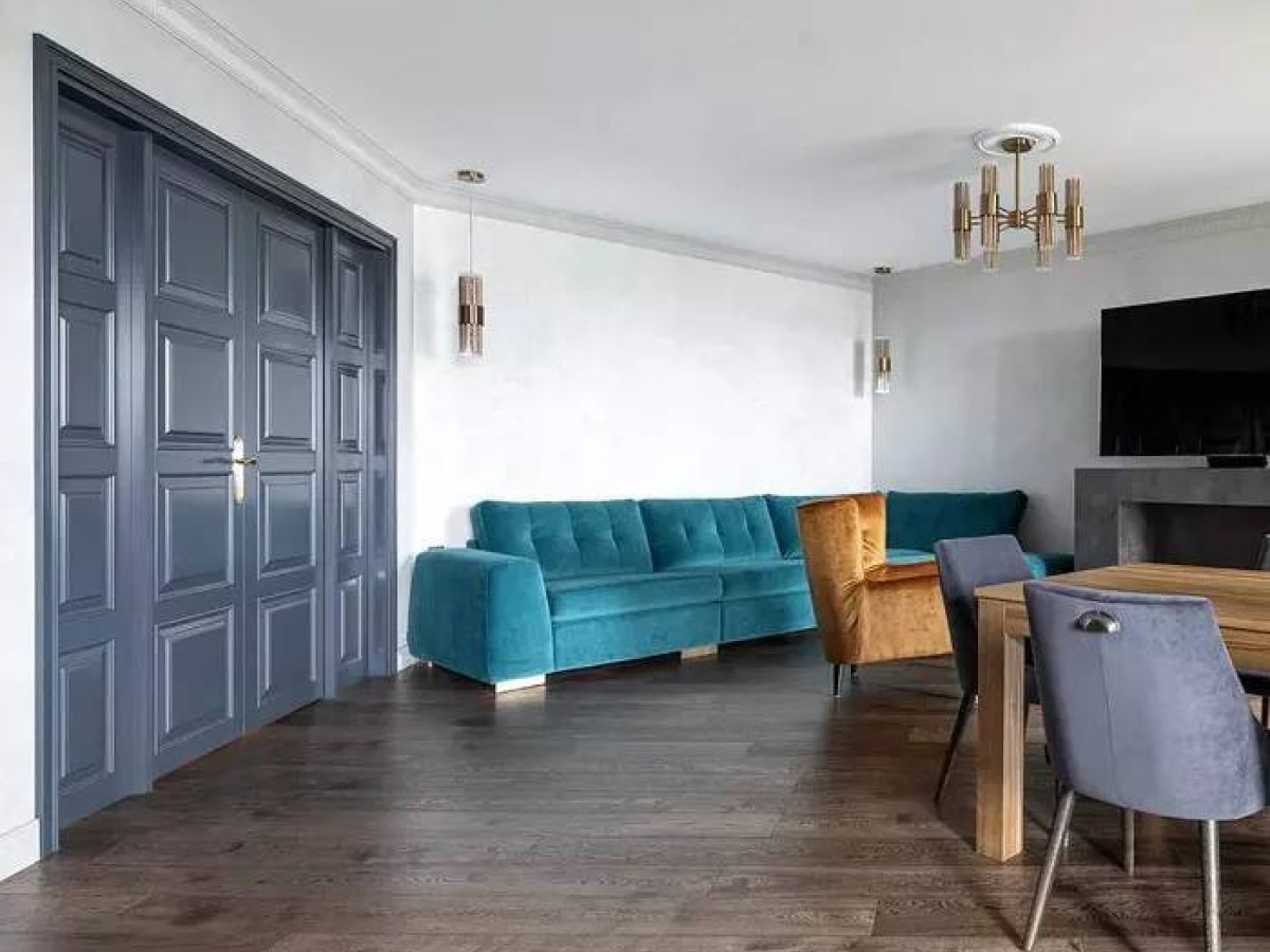 Яркий лазурный оттенок обивки, контрастные белые ножки из массива и декор подушек в технике капитоне – детали, которые приковывают взгляд.