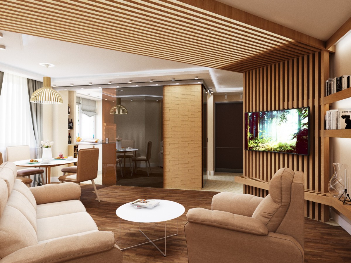 В отделке предложили спокойную цветовую гамму , которая не только наполнила комнаты светом, но и выделила декоративные деревянные инсталяции из тонированной березы.