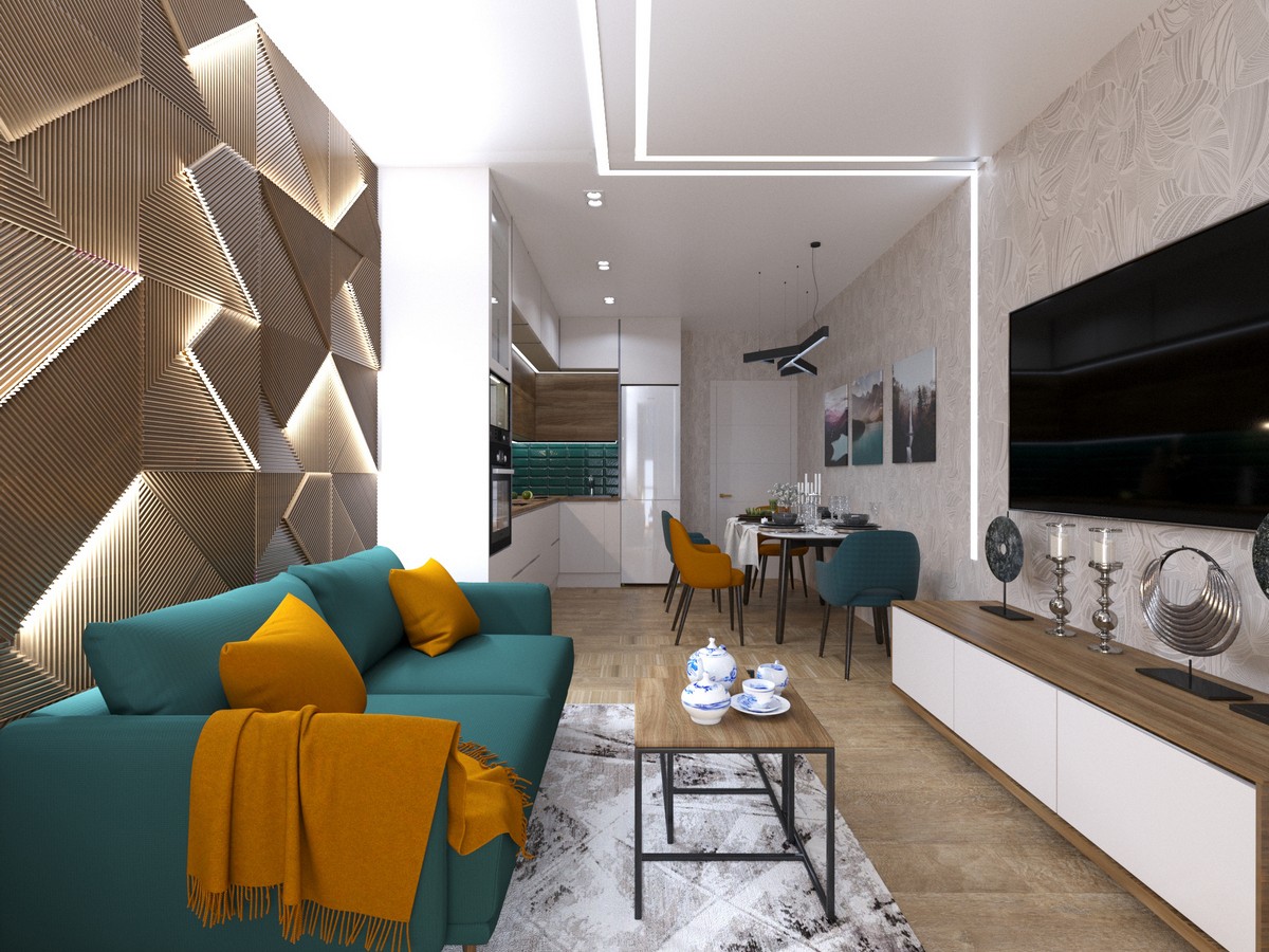 Деревянная 3D-панель в гостиной и подсветка подчеркнули романтическую атмосферу отдыха и расслабления.