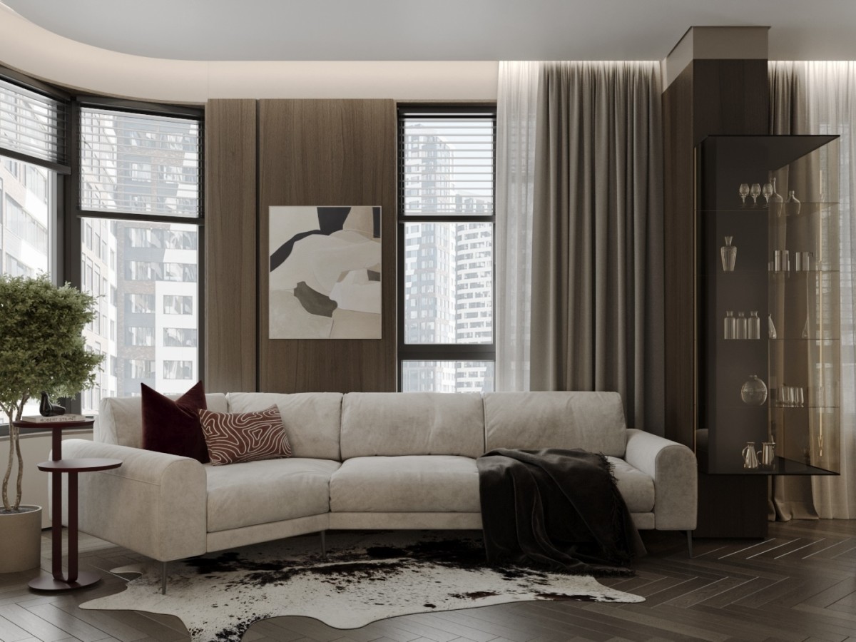Конфигурация с развернутым модулем идеально вписалась в помещение с закругленными окнами.
