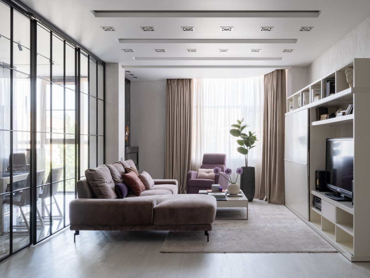 Световой сценарий здесь подразумевает точеные светильники, подсветку и трековые системы, подчеркивающие сдержанность интерьера.