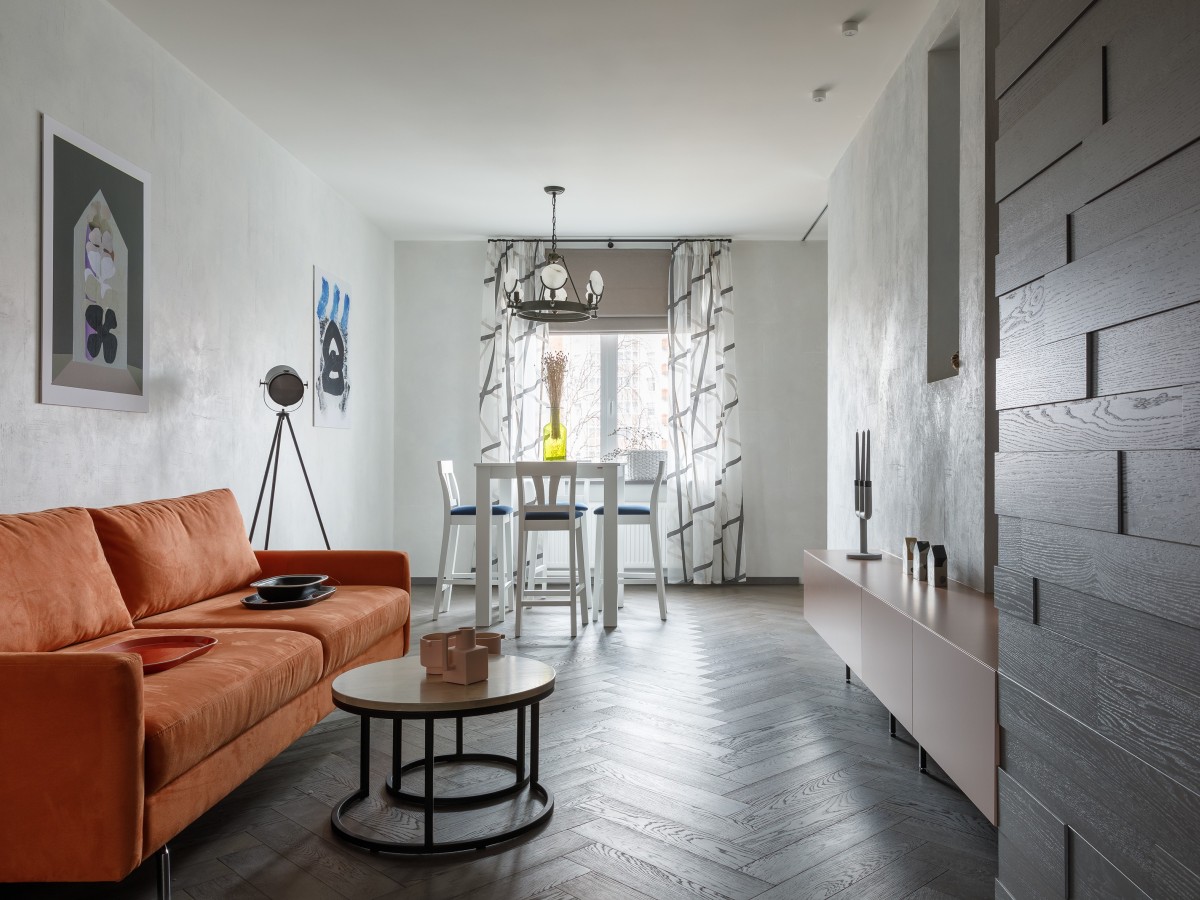 Диван от Hauska выполнен в велюровой отделке яркого рыжего цвета и является своего рода композиционной доминантой гостиной.