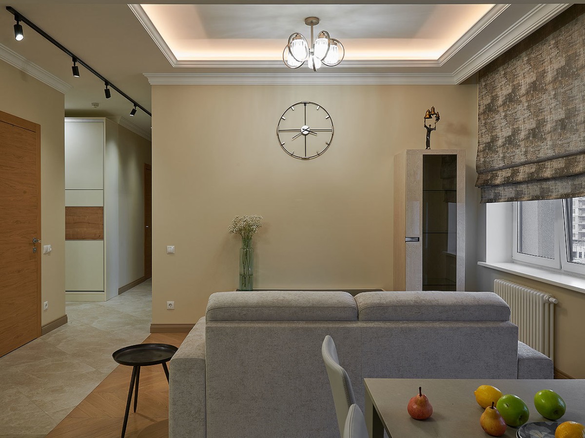 Кухня-гостиная была выполнена в серо-бежевых оттенках, сам кухонный гарнитур с гладкими фасадами, чтобы сбалансировать пространство, не перегрузить его, а гармонично дополнить, необходимо было подобрать мягкую группу простой и правильной формы.