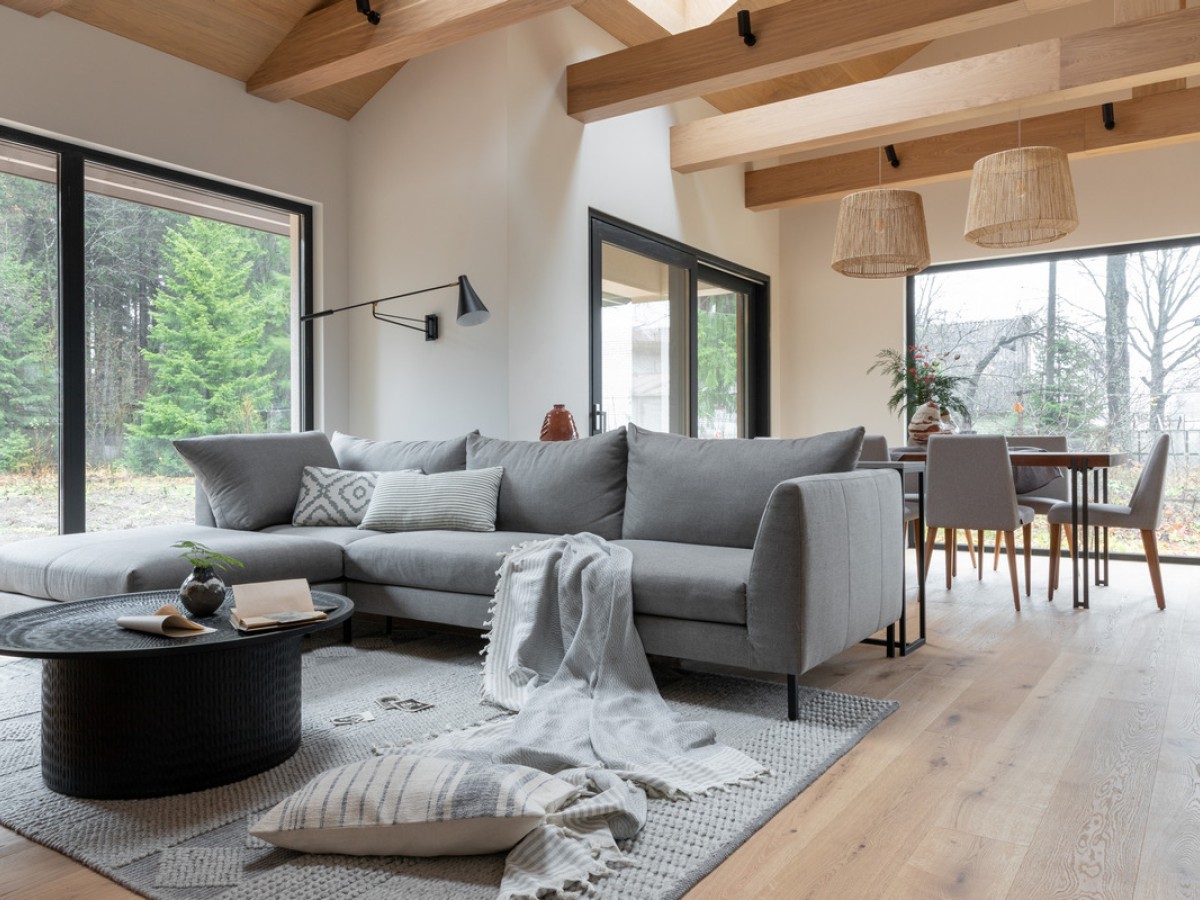 Центром притяжения гостиной стал вместительный модульный диван из коллекции LOFT в практичной серой обивке c легкой текстурой рогожки.