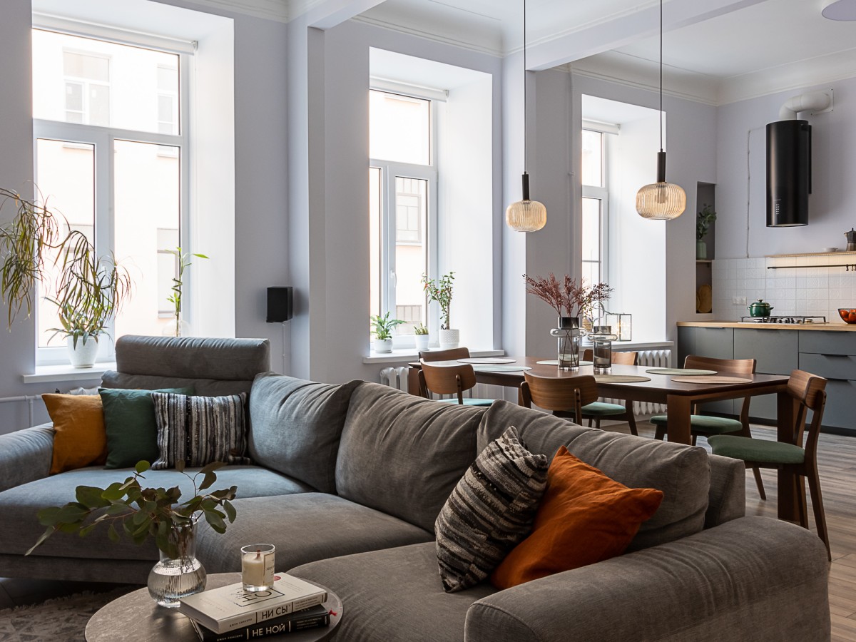 Квартиру в доме постройки начала 20 века отличала анфиладная планировка, но благодаря продуманному распределению назначения комнат и приемам зонирования, удалось создать уютные и комфортные для жизни приватные зоны.