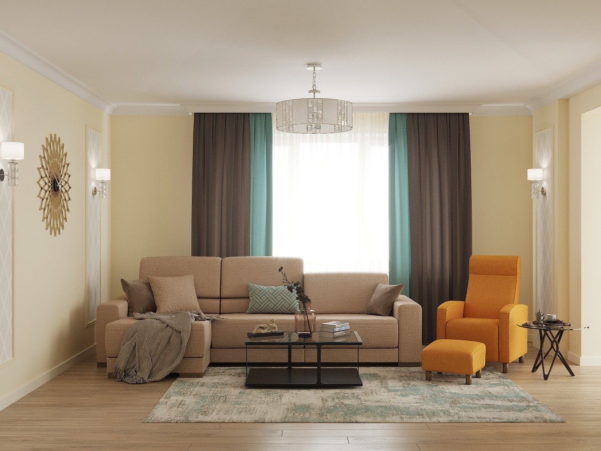 В интерьере использованы нейтральные оттенки бежевого, кремового и яркие элементы желтого, темной бирюзы, насыщенного коричневого.