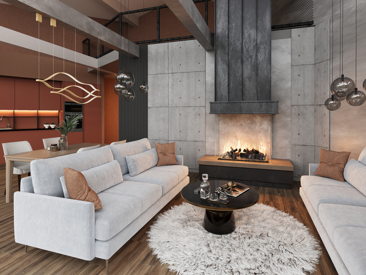 Объединенная зона с камином – любимое место отдыха всей семьи и комфортное пространство для встреч с друзьями.