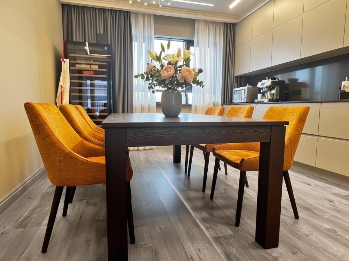 Их яркая акцентная обивка привносит солнечный свет в пространство и выделяется на фоне сдержанной цветовой гаммы кухни-столовой.