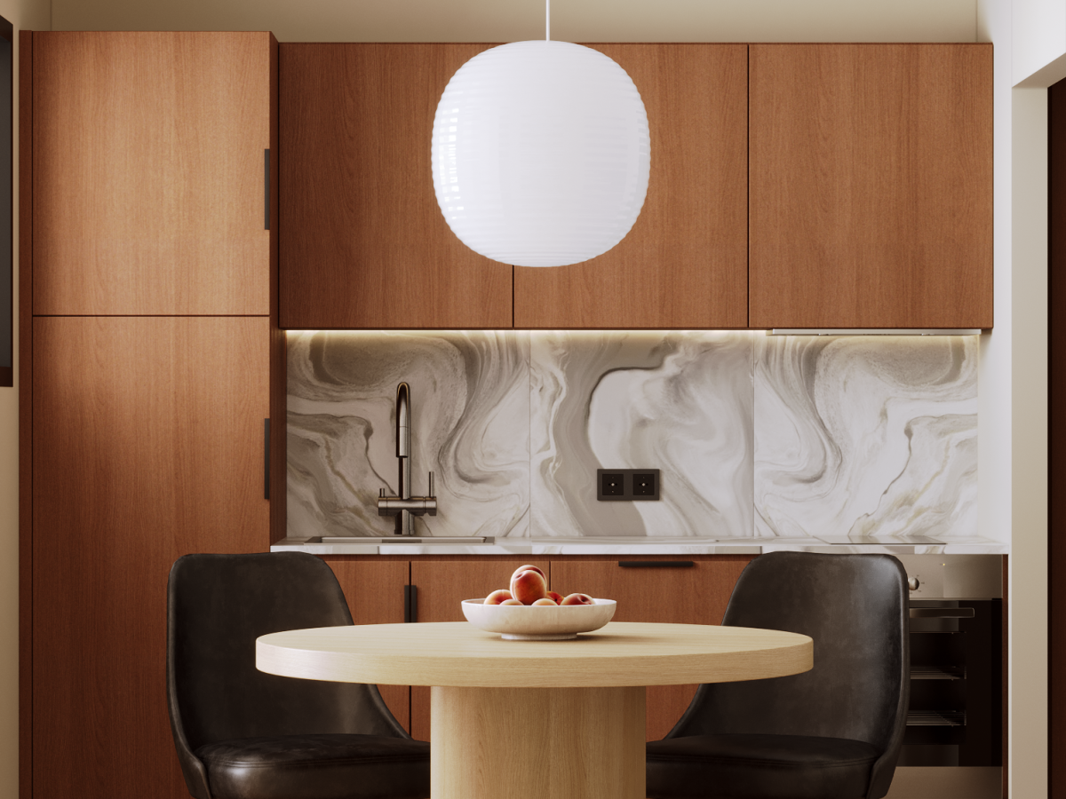 Из коридора мы попадаем в кухню-гостиную, где над столом расположена подвесная люстра на случай, если нужно будет второе рабочее место.