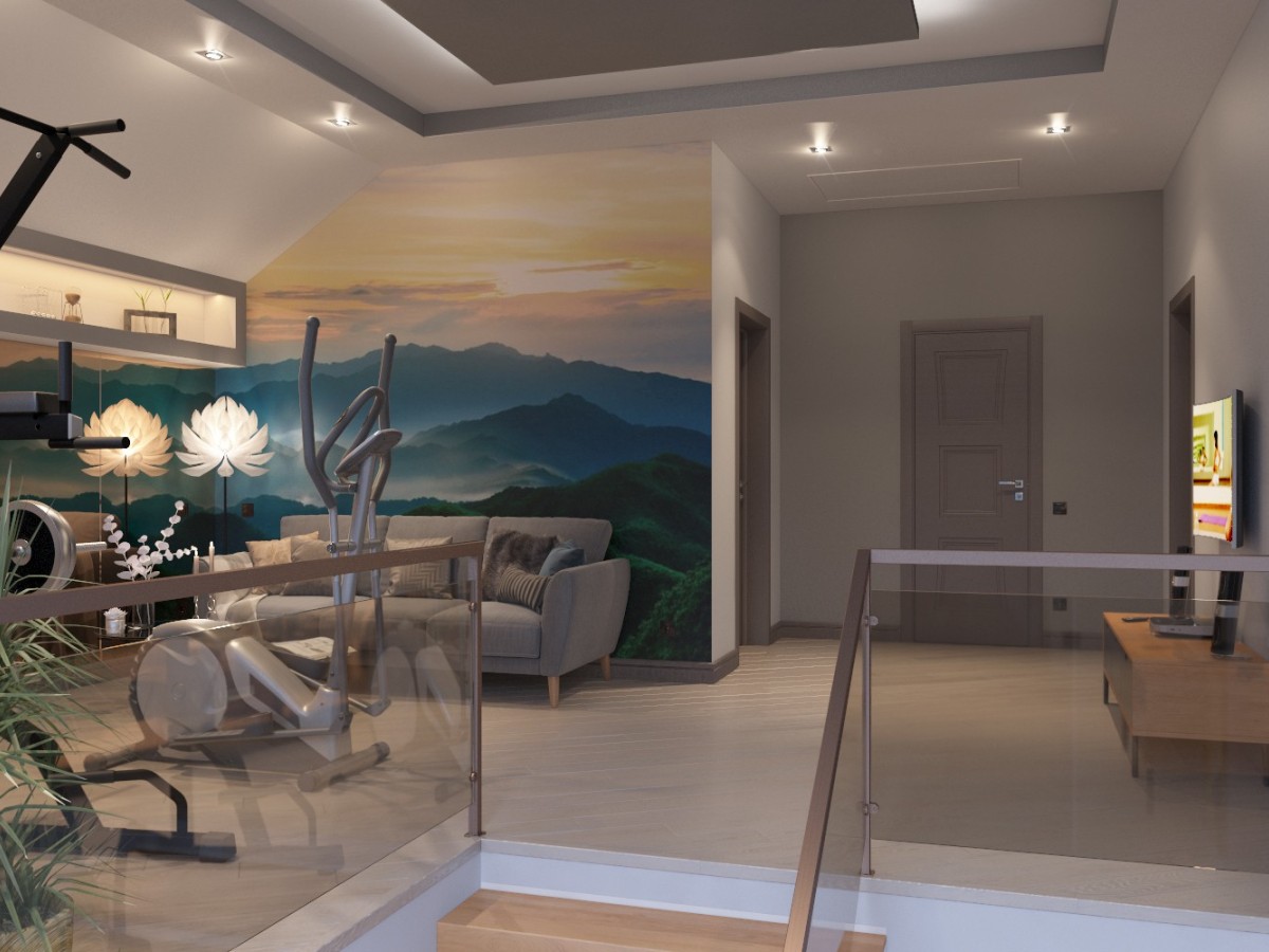 На верху спальня родителей, детская комната, кабинет и большой холл с функцией домашнего кинотеатра и тренажерного зала.