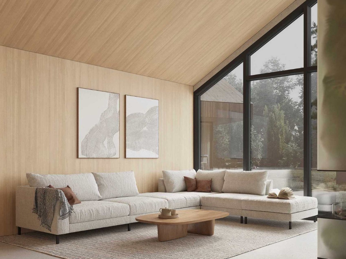 Главный акцент в интерьере этого загородного дома – панорамное окно, вид из которого меняется от сезона к сезону. Природа здесь не просто часть дизайнерского решения, это доминанта, которая выстраивает вокруг себя пространство и диктует правила. Среди них – нейтральный фон, органично продолжающий природную линию вне зависимости от красок за окном. Деревянные панели на стенах и потолке, фактура цемента на кухонном фартуке и на полу прекрасно решают эту задачу. Здесь нет ничего лишнего: максимальная лаконичность и функциональность призваны выдвинуть природу на первый план. Просторный угловой диван Loft от HAUSKA словно растворяется в пространстве. Открытые модули, актуальные формы и обивка букле придают легкую динамику мягкой зоне, но при этом погружают в атмосферу отдыха и расслабления. Кроме того, тактильность и объем придают фактурные постеры и ковер с плетением. Нейтральность интерьера уравновешивает темная графика: оконная рама, светильник над кухонным островом, бытовая техника, посуда и барные стулья Vilja от HAUSKA. Округлые формы в конструкции сиденья и ножек подчеркивают мягкость модели Vilja , а небольшое отверстие придает стульям воздушный и ироничный вид. Пространство кухни-гостиной выстраивается по принципам философии ваби-саби, главная ценность которой – красота момента во всей ее естественности.