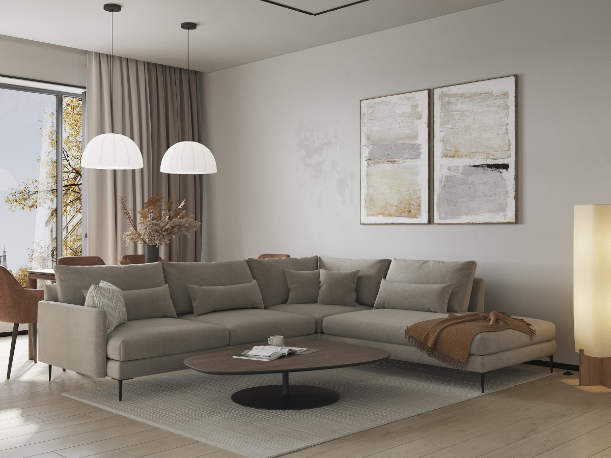 Среди преимуществ открытой планировки часто отмечают ощущение простора, легкость и воздушность атмосферы, больше света и вариантов зонирования. Как правильно использовать такие гибкие характеристики помещения? Разберемся на примере одного из проектов объединенной зоны кухни-столовой-гостиной. Совмещение этих трех зон позволяет организовать многофункциональное пространство, где можно готовить, проводить время с друзьями, устраивать семейные обеды. Причем свободное пространство не стоит загромождать в попытке использовать каждый сантиметр. Смысл таких планировочных решений как раз в отсутствии визуального шума. Здесь нет лишней мебели и обилия аксессуаров, на первое место выходят функциональность, свет и воздух, поэтому стилистически такие помещения ближе к минимализму. Мебель обыгрывает идею лаконичной многофункциональной зоны. Так, корпусная мебель становится продолжением стен, преимущественно используются скрытые системы хранения, а при организации мягкой зоны стоит рассмотреть модульные конфигурации. Например, угловой диван с открытым модулем FEEL эффектно зонирует пространство в комбинации с креслом из этой же коллекции. Благодаря тонкому подлокотнику, изящной форме высоких ножек и открытому модулю, диван визуально не утяжеляет интерьер. Светлая серо-бежевая обивка сочетается с нейтральным цветом стен. Столовая зона – акцентная в интерьере благодаря цвету мягких стульев FINE . Для обивки выбран природный терракотовый оттенок, который создает теплую гармоничную атмосферу в пространстве. Панорамные окна в пол в этой зоне создают ощущение обеда на террасе. Меняющийся природный пейзаж за окном – словно еще одно декоративное решение, которое естественным образом трансформируется в зависимости от сезона. Мебель не должна загораживать окна, позволяя естественному освещению свободно проникать в пространство. Еще одним органичным декоративным решением в таких интерьерах станут натуральные материалы – дерево, камень, текстиль. Их сочетания, комбинации различных тонировок и оттенков создают объем и динамику в сдержанном пространстве.