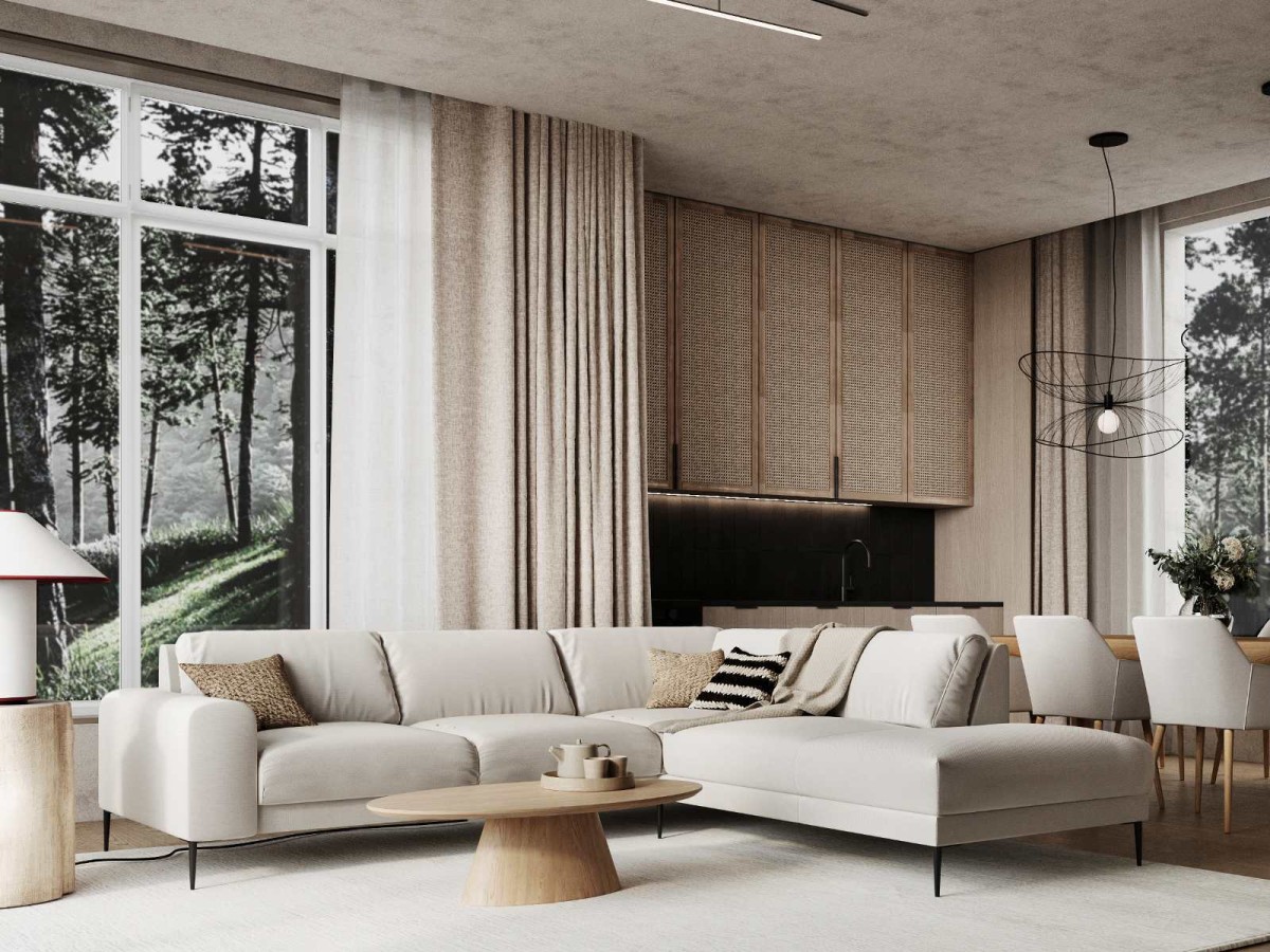 Светлые оттенки в интерьере привносят в пространство атмосферу легкости, в сочетании с аксессуарами создают ощущение праздника, а в комбинации с природными материалами настраивают на расслабление и отдых. Молочная палитра текстиля, беленый дуб и натуральное дерево в кухне-гостиной загородного дома легко решили именно эту задачу, воплотив гармоничный и воздушный интерьер с нотками ваби-саби. Современное пространство грамотно зонировано. В мягкой зоне – угловой диван Joy от HAUSKA в светлой обивке. Округлые формы модели, широкие подлокотники и при этом высокие графичные ножки – стильный образ для эффектной гостиной. Ковер и обеденные стулья Fine выполнены в том же оттенке. Декоративные подушки с геометричным орнаментом придают динамики, но не создают визуального шума, аккуратно интегрируясь в общую концепцию. Пару угловому дивану составляет широкое кресло из той же коллекции, завершая композицию уютной гостиной. Разные фактуры дерева светлых тонов гармонично сочетаются между собой, поддерживают теплую атмосферу и подчеркивают природную составляющую в пространстве. Массивный стол Zoom в тонировке натурального дуба – основательный элемент в объединенной зоне, который уравновешивает остальные предметы мебели. Неуловимая легкость и простота в пространстве, наполненным естественным светом, оживают благодаря пробуждающейся красоте природы за высокими панорамными окнами.